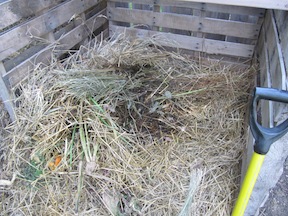 Step 2. Add vegetable scraps (no meat, dairy, animal products for best results) by lifting a layer of the straw or leaves and burying the scraps in the pile. If you have big volumes from a large family or canning time then layer your scraps with dry brown material. Just don’t dump a five gallon bucket in one place in the pile unless you don’t care about odor. Remember, that stink is wasted nitrogen that could become the protein in the bodies of even more of your helpers. Plus it could upset the neighbors or attract vermin.